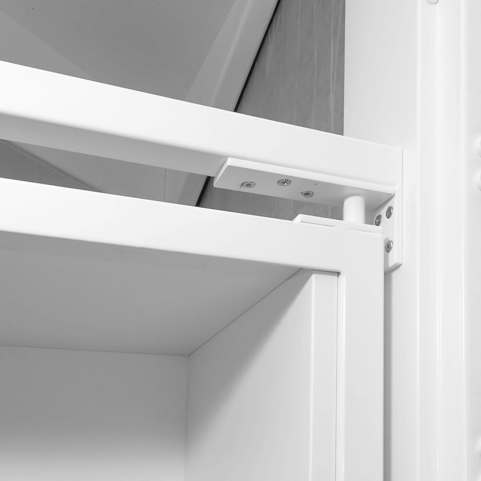 Gemaakt van kwalitatief hoogwaardige meubelpanelen. Bevestigd in de deuropening van uw trapkast d.m.v. een metalen frame.