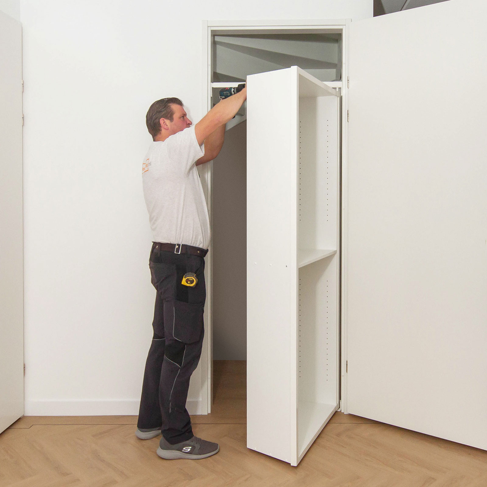 De SlimmeKast is een draaikast die als een deur kan worden geopend. Hij wordt geplaatst in het deurkozijn van uw trapkast. De SlimmeKast kan ook worden geplaatst in o.a. overloopkasten, gangkasten en technische ruimtes met warmtepomp-installaties